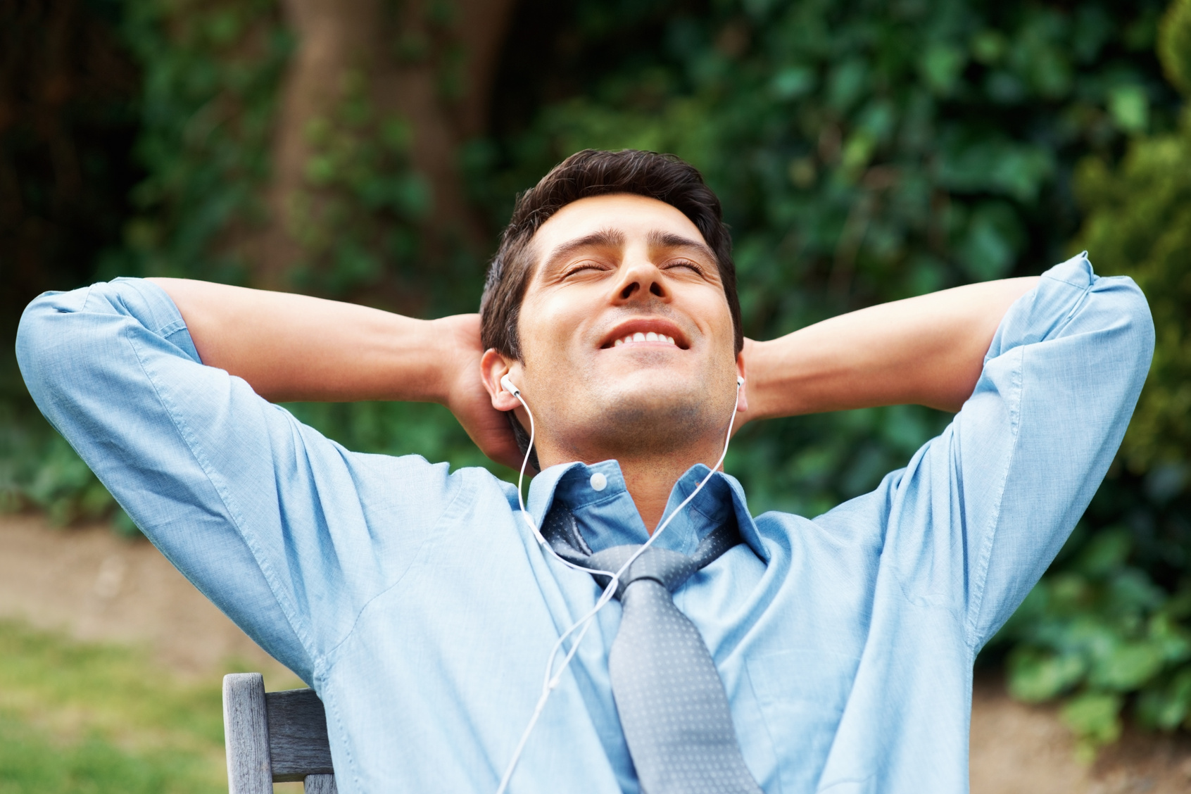 Closeup of executive leaning back with eyes closed and hands behind head
